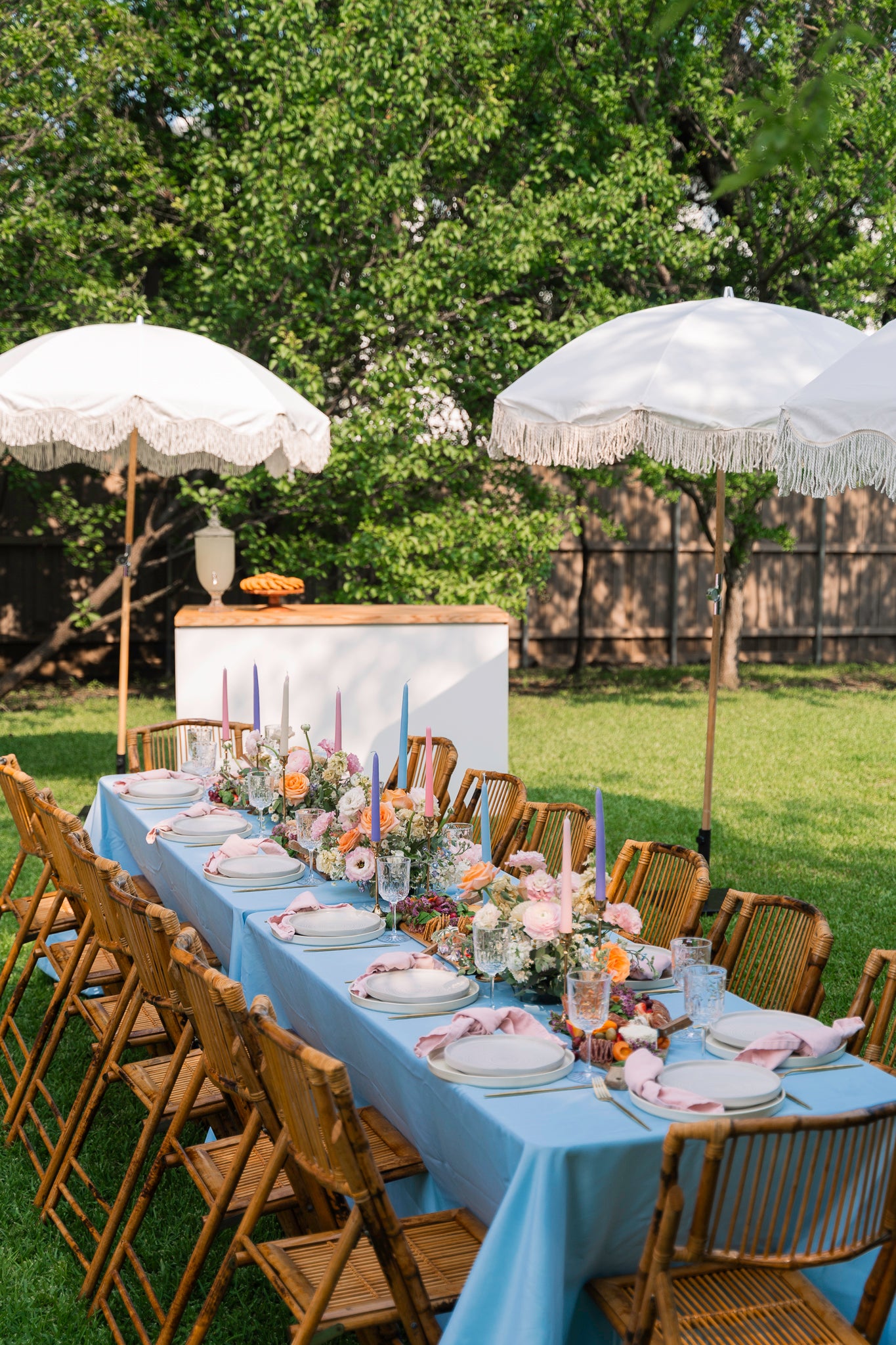 Select from our inventory of plates, cups, napkins, and flatware, including kid-safe shatterproof options. Design a custom tablescape with us for an additional $200.